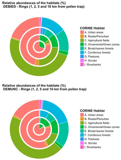 - Cariñanos, P.; Adinolfi, C.; Díaz de la Guardia, C.; De Linares, C.; Casares-Porcel, M. Characterization of allergen emission sources in urban areas. J. Environ. Qual. 2016, 45, 244. [Google Scholar] [CrossRef]