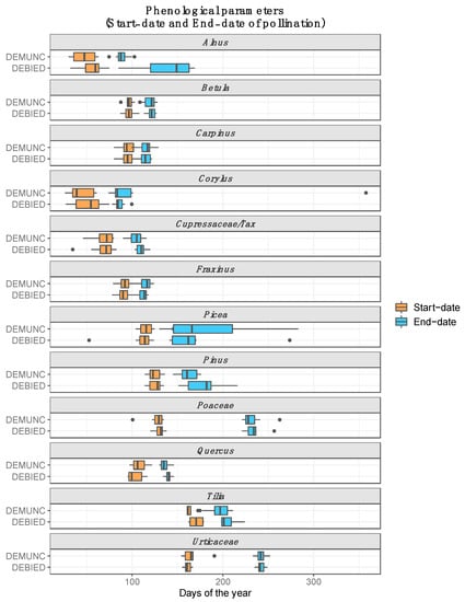 - Picornell, A.; Buters, J.; Rojo, J.; Traidl-Hoffmann, C.; Menzel, A.; Bergmann, K.C.; Werchan, M.; Schmidt-Weber, C.; Oteros, J. Predicting the start, peak and end of the Betula pollen season in Bavaria, Germany. Sci. Total Environ. 2019, 690, 1299–1309. [Google Scholar] [CrossRef]