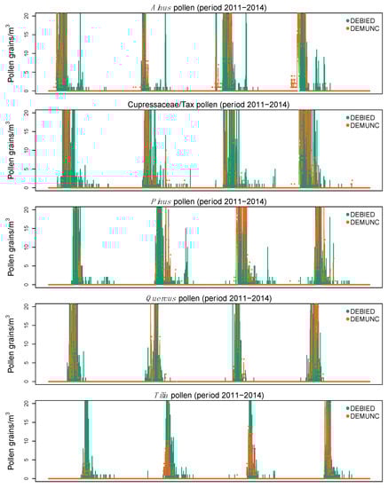 - Picornell, A.; Oteros, J.; Trigo, M.M.; Gharbi, D.; Docampo Fernández, S.; Melgar Caballero, M.; Toro, F.J.; García-Sánchez, J.; Ruiz-Mata, R.; Cabezudo, B.; et al. Increasing resolution of airborne pollen forecasting at a discrete sampled area in the southwest Mediterranean Basin. Chemosphere 2019, 234, 668–681. [Google Scholar] [CrossRef]