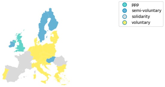 Stylized version of current flood insurance systems in EU countries. The voluntary system has risk-based premiums, private reinsurance, and a voluntary uptake; the semi-voluntary system is similar except uptake is required for a mortgage; the solidarity system has a mandatory uptake and no premium differentiation; the public–private partnership (ppp) has a mandatory uptake, limited risk-based premiums and a public reinsurer.
