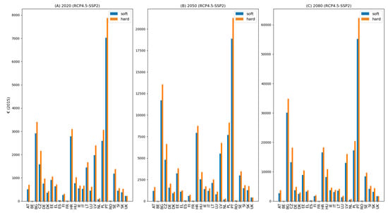 Figure 3 shows the impact of a hard and a soft capital market for reinsurance on the unaffordability of flood insurance for EU countries in 2020, 2050, and 2080. The graph shows the results for countries with (semi-) voluntary insurance arrangements, since these insurance systems are more prone to volatility on the capital market for reinsurers, as coverage is obtained from private reinsurers. Countries with a solidarity-based or a public–private partnership are excluded from later graphs, as these are not impacted by the capital market conditions resulting from remote natural catastrophes, because reinsurance is provided by governments.