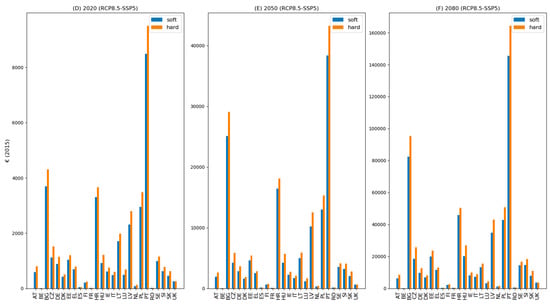 Average annual premiums in 2015 Euros for status-quo insurance systems in EU countries, for soft (blue) and hard (orange) reinsurance markets. Subplots A, B and C show results for 2020, 2050 and 2080, for RCP4.5-SSP2. Subplots D, E and F show results for 2020, 2030 and 2080, for RCP8.5-SSP5.