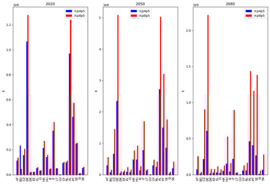 Uninsured annual flood risk for EU countries with voluntary insurance systems, under soft reinsurance market conditions, for RCP4.5 (blue) and RCP8.5 (red), for 2020, 2050, and 2080. Countries that provide public reinsurance for flood insurance are excluded here, as these are not exposed to global reinsurance market volatility resulting from large natural catastrophes. Additionally, countries with semi-voluntary insurance systems are excluded here, since insurance uptake is a mortgage requirement and is therefore less responsive to capital market shocks.