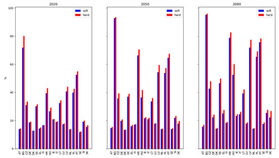 The percentage of the population that cannot afford insurance under soft market conditions (blue) and hard conditions (red), for EU countries in 2020, 2050, and 2080, for RCP8.5. Countries that provide public reinsurance for flood insurance are excluded here, as these are not exposed to global reinsurance market volatility resulting from large natural catastrophes.