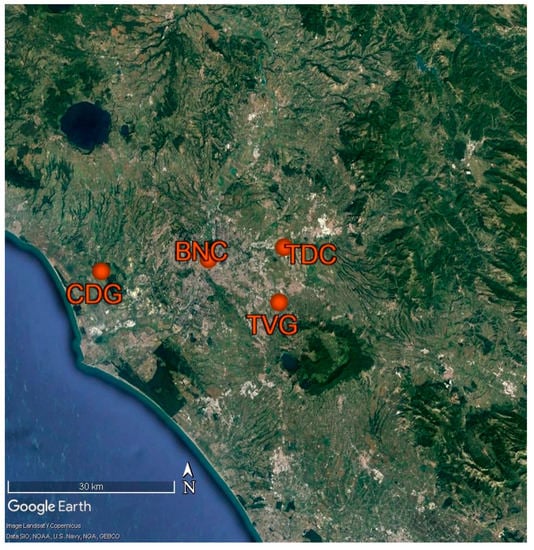 Location of the ARPA Lazio micro-meteorological network (BNCu, Rome city center; CDGr, Castel di Guido; TVGr, Tor Vergata; TDCs, Tenuta del Cavaliere).
