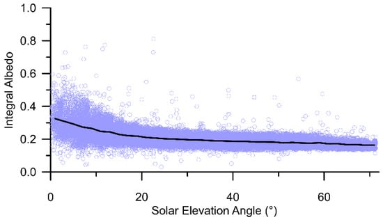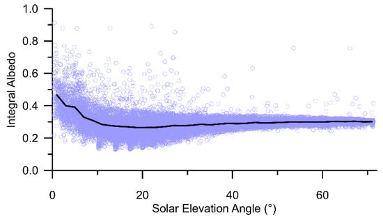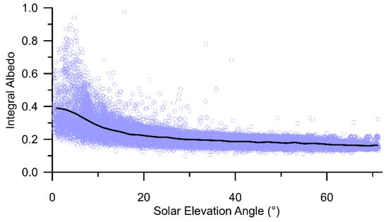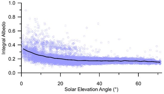 Figure 2, Figure 3, Figure 4 and Figure 5 show the behavior of A retrieved by Equation (1) as a function of the incident solar radiation (all data were averaged over 2° solar elevation angle intervals, including observations in both clear and cloudy conditions)The integral albedo coefficient decreases with the increase of the solar elevation angle, as foreseen by Equation (1), and its behavior is consistent with that reported in [29], including the scatter of the measurements usually attributed to both a sudden variation of the incident solar radiation (because of the fast passage of cloudy) and/or instrumental noise.