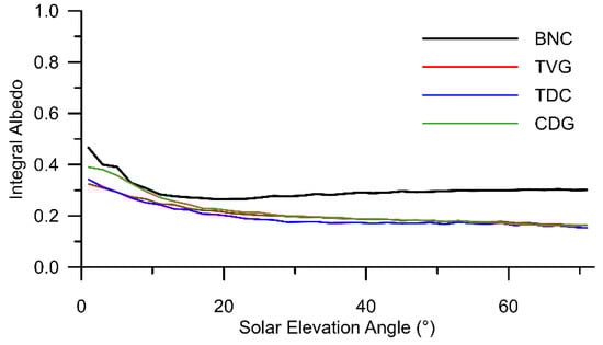 Integral albedo coefficients as a function of solar elevation angle for all the sites.