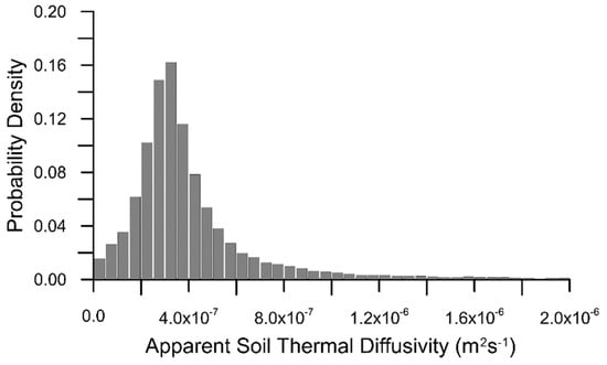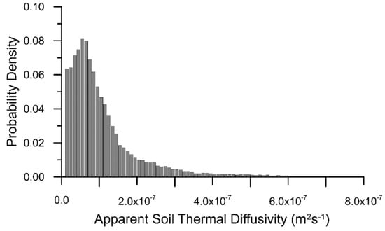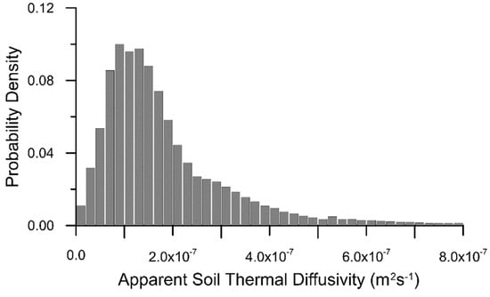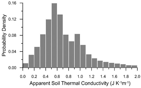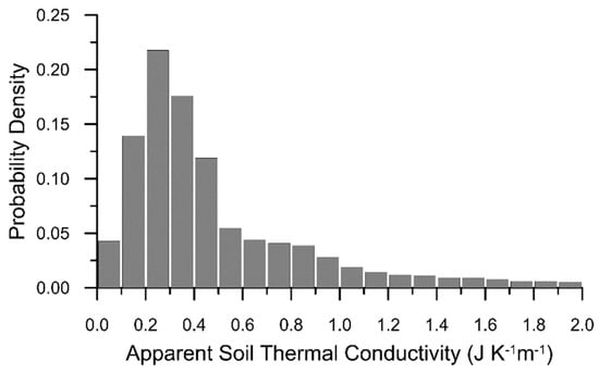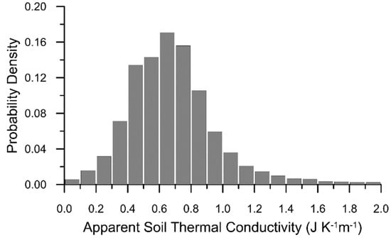 Figure 10, Figure 11 and Figure 12 show the probability density of the soil Apparent Thermal Conductivity obtained from the semi-hourly measurements at the three non-urban locations. Additionally, in this case, the distributions are not symmetrical and are characterized by a long tail towards the highest values representing sparse rain events of different intensities along the year.