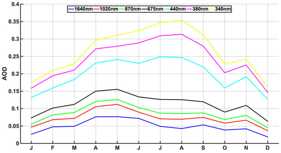 Monthly mean of aerosol optical depth (AOD) at all seven Aerosol Robotic Network (AERONET) wavelengths, calculated for months with at least 15 days of data.
