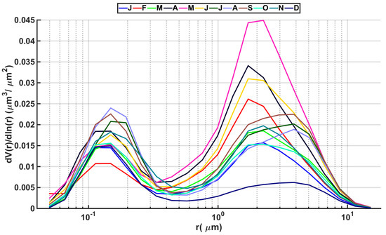 Figure 3 shows the mean size distribution per month, providing more evidence for the arguments presented in the previous paragraph. The coarse mode has its maxima in May, June and April, which is the period with the highest occurrence of Saharan dust events in the area due to enhanced cyclonic activity [50]. Meanwhile, the fine mode shows maximum values during August, September and July. December is the period in which fine mode dominates, while the coarse mode has very low values. In January, the two fractions are almost equal. February also shows a coarse mode double the fine mode. Regarding the coarse mode, June, August and September have their peaks in a higher radius than the other months, suggesting the presence of even bigger particles in the mixture. It should be highlighted that direct sun and inversion retrievals are extracted from different measurements in the data set (direct sun and almucantar), but in the current dataset, the fine/coarse behavior converges.