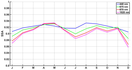 Mean Single Scattering Albedo (SSA) values at 440, 675, 870 and 1020 nm per month with AERONET level 1.5.