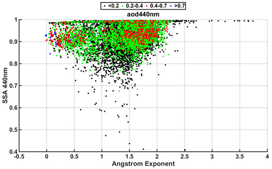 SSA 440 nm in respect to the Ångström exponent 440–870nm, categorized according to the AOD for the whole period.