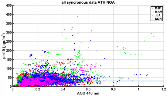 For the comparison of in-situ data with AERONET measurements, a new dataset has been created by the linear interpolation of PM10 hourly averaged values to the CIMEL recording moments. The comparison between these datasets is considered synchronous; otherwise, daily average values have been compared. In Figure 6 and Figure 7, blues lines represent the mean AOD at 440 nm and mean PM10, respectively, for that period. At Table 1, the relative frequencies of the four quadrants created by the mean values (blues lines) are presented in order to clarify the seasonal variations of the conditions.