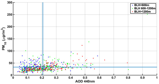Daily averages of AOD440 nm against PM10, separated by boundary layer height (color); blue lines show the mean AOD and mean PM10 for this dataset.