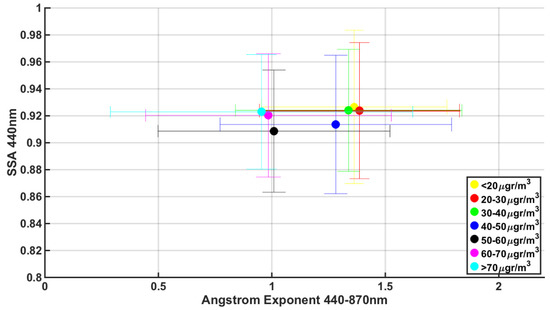 Figure 8 shows the mean SSA 440 nm values and mean Ångström exponents according to PM10 concentration classes. A high PM10 (>50 μg/m3) is linked with columnar mixtures with coarse mode aerosol dominance. The lowest mean SSA values are found when PM10 concentrations are recorded in the range of 50–60 μgr/m3, which indicates the presence of dust cases in this class and probably some brown carbon during winter. Lower α values are found mainly with high PM10. It is interesting that 87.55% of the data with AOD values > 0.6 also have PM10 values > 60 μgr/m3, α < 1 and SSA > 0.9, which means these are cases of high coarse aerosol loads of a scattering nature spread across the column. PM10 classes lower than 40 μg/m3 are associated with higher Ångström exponents; hence, lower concentrations of surface particles have statistically higher fine mode fractions. SSA error bars represent 1σ, which for all PM10 classes covers the largest part of the expected SSA range in the atmosphere. Beyond that fact, the classes of 40–60 μgr/m3 have a systematically more absorbing columnar behavior.