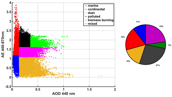 AOD at 440 nm against the Ångström exponent, classified according to Dubovik et al. [72] for the whole dataset (left). Pie chart of the Dubovik et al. [72]. classification for the whole dataset (right).