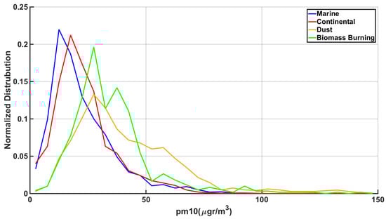 When this characterization is applied to the synchronous PM10 data, it appears that marine and continental aerosol cases are usually associated with lower PM10 values, while biomass burning and dust particles are more frequently recorded with higher PM10 values. In Figure 10, the normalized distribution of the classification of the cases in respect to PM10 is presented. It is clear that, above 40 μgr/m3, the recorded columnar condition is at 82% related to dust or biomass burning. Since these conditions are usually attributed to the long-range transport of aerosols, it is interesting that it also leads to higher concentrations on the ground, indicating that there is at least a partial deposition effect.