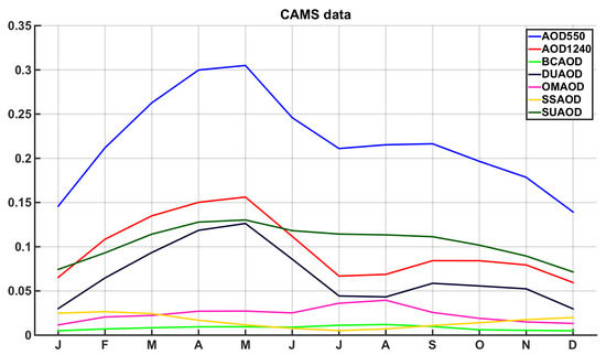 Copernicus Atmosphere Monitoring Service (CAMS) mean monthly values for AOD at 550 and 1240 nm and AOD for aerosol types (black carbon―BCAOD, dust―DUAOD, organic matter―OMAOD, sea salt―SSAOD, sulfate―SUAOD).