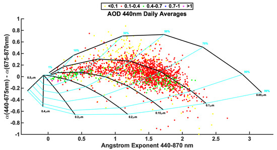 Gobbi plot for daily-averaged AERONET data [72]. Black lines represent the size of the fine mode Rf, and cyan lines represent the fixed fraction contribution of the fine mode to total AOD. Colors of dots represent ranges of AOD at 440 nm.