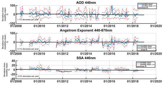 Figure 13 reports the trends of AOD during the measured 10-year period (2008–2018). Deseasonalization is calculated by eliminating the mean monthly value of the corresponding month. Afterwards, the trend calculations are performed by estimating a linear fit in the deseasonalized timeseries. AOD at 440 nm decreases during the measurement period, at a rate of 1.1% per year. The Greek Ministry of Environment and Energy, in its annual report, has reported a 1.6% decrease of mean PM10 daily values, for the same period, for the station Aristotelous, which is located 1 km from NOA’s measuring site [74]. Thus, the negative trend is mainly due to the decrease of urban emissions in the basin during this period. The antipollution measures combined with decreased industrial/transportation activity during the financial crisis are the main factors that are driving a decrease in local urban aerosol emissions. This trend is within the range reported for Europe in the last decade [23].