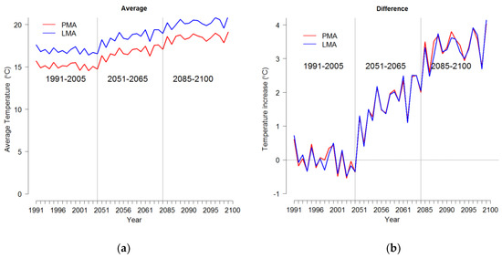 The temperature in LMA is estimated to increase from a yearly mean of 16.89 °C in 1991–2005 to a yearly mean of 18.61 °C and 20.25 °C in future periods 2051–2065 and 2085–2099, respectively. In the same vein, temperatures in PMA are estimated to rise from 15.09 °C in the current period to 16.81 °C and 18.50 °C in the future periods, respectively. The differences observed in these future temperatures are depicted in the Figure 1b.