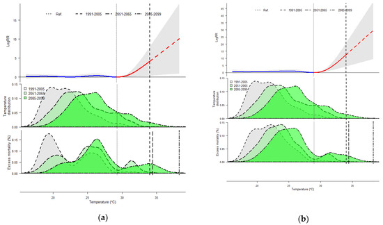 Temperature related mortality and excess mortality for the present and projected future periods in Lisbon metropolitan area (LMA) during the summer period for people aged <65 years (a) and 65+ years (b). Top panel: Exposure-response curve for temperature-mortality cumulative associations (logRR). The solid lines represent the logRR and the gray areas the 95% empirical confidence interval. The dotted vertical line corresponds to reference temperature (MMT) which divides the curve into cold and hot (blue and red lines, respectively). Middle panel: distribution of temperature values for the present period, 1991–2005 (grey area) and future periods, 2051–2065 (green area) and 2085–2099 (darker green area). Bottom panel: distribution of temperature-related excess mortality, expressed as the fraction of additional deaths (%) attributed to non-optimal temperature, compared with the reference temperature.