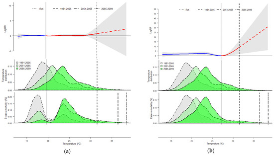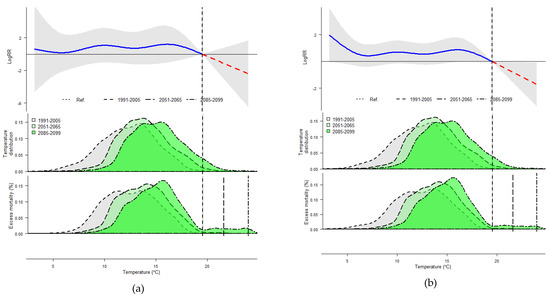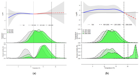 Temperature related mortality and excess mortality for the present and projected future periods in Porto metropolitan area (PMA) during the winter period for people aged <65 years (a) and 65+ years (b). Top panel: Exposure-response curve for temperature-mortality cumulative associations (logRR). The solid lines represent the logRR and the gray area the 95% empirical confidence interval. The dotted vertical line corresponds to reference temperature (MMT) which divides the curve into cold and hot (blue and red lines, respectively). Middle panel: distribution of the temperature values for the present period, 1991–2005 (grey area) and future periods, 2051–2065 (green area) and 2085–2099 (darker green area). Bottom panel: distribution of temperature-related excess mortality, expressed as the fraction of additional deaths (%) attributed to non-optimal temperature compared with the reference temperature.