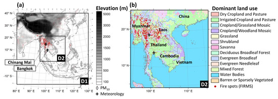 Locations of observation sites for PM10 and meteorology, and fire spots (MCD14DL) provided by Fire Information for Resource Management System (FIRMS) on 21 March 2014 in the modeling domains covering (a) East Asia (D1) and (b) Indochina (D2). Elevation and dominant United States Geological Survey (USGS) 24-category land use are provided in (a) and (b), respectively.