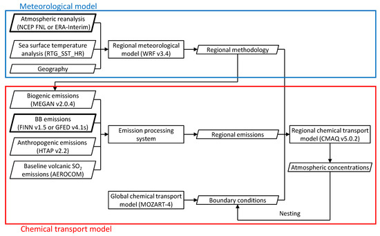 CMAQ was configured with the Carbon Bond chemical mechanism (CB05) [28] for gas-phase chemistry and the sixth generation CMAQ aerosol module for the aerosol process. The initial and lateral boundary conditions for D1 were obtained from the Model for Ozone and Related Chemical Tracers v4 (MOZART-4) [29]. Several datasets were used to produce emission data. In particular, the Fire INventory from NCAR (FINN) [11] v1.5 or the Global Fire Emissions Database including small fires (GFED v4.1s) [30] was selected for BB emissions. FINN v1.5 provided 1 km-resolution BB emissions estimated from the active fire observations from the Moderate Resolution Imaging Spectroradiometer (MODIS) Terra and Aqua satellite. GFED v4.1s provided 0.25°-resolution BB emissions estimated from the 500 m Collection 5.1 MODIS direct broadcast burned area product plus additional burned area from small fires based on a revised version of the Randerson et al. [31] small-fire estimation approach. Anthropogenic emissions were obtained from the Task Force Hemispheric Transport of Air Pollution (HTAP) v2.2 inventory [32]. The other natural emissions were derived from the Model of Emissions of Gases and Aerosols from Nature (MEGAN) [33] v2.04 for biogenic emissions and the Aerosol Comparisons between Observations and Models (AEROCOM) data [34] for baseline volcanic SO2 emissions. There were differences between the periods of simulations and the reference years in the anthropogenic emission data available for the simulations, and the uncertainties associated with the differences may have affected model performance.