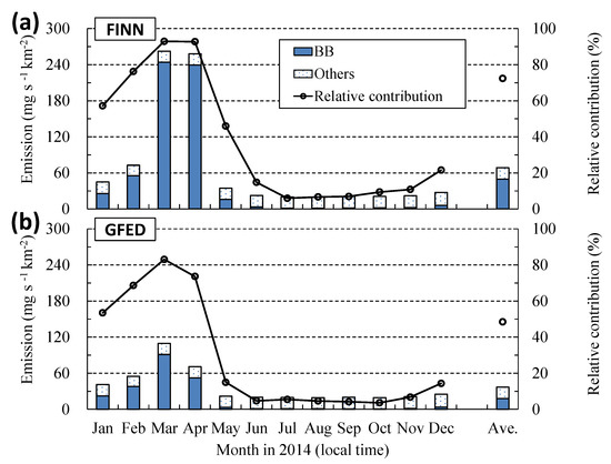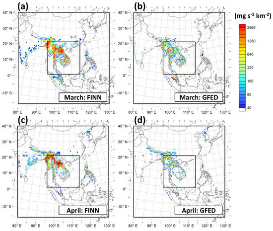 Several BB emission inventories are available, such as the Fire INventory from NCAR (FINN) [13], the Global Fire Assimilation System (GFAS) [14], and the Global Fire Emissions Database (GFED) [15]. BB emission inventories have substantial uncertainties in their temporal and spatial variabilities because the data to estimate the emissions of BB, such as area, fuel loading, and emission factors, are limited [13,15]. Vongruang et al. [16] reported that PM10 was overestimated in air quality simulation with FINN, whereas PM10 was underestimated with GFAS in the source region of Northern Thailand in March 2012.