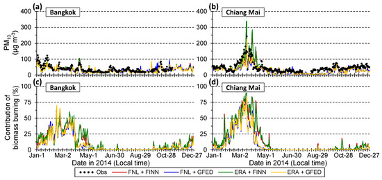 Time series of simulated and observed daily mean concentrations of PM10 at (a) Bangkok and (b) Chiang Mai and estimated daily mean relative contributions of BB at (c) Bangkok and (d) Chiang Mai.