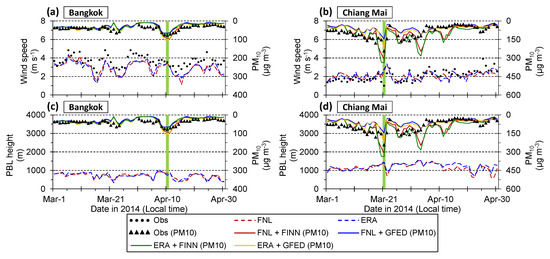 Time series of simulated and observed daily mean wind speed at (a) Bangkok and (b) Chiang Mai, and simulated daily mean planetary boundary layer (PBL) height at (c) Bangkok and (d) Chiang Mai. The simulated and observed daily mean concentrations of PM10 were also shown. The day when maximum PM10 concentration was observed from March to April 2014 at each site was highlighted.