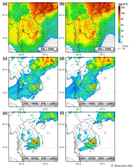 This approach is applicable to other years and atmospheric pollutants to evaluate the impacts of selected input datasets on air quality simulations in polluted areas caused by BB. For example, GFAS can be used for one of the other BB emission inventories. However, emission factors of global BB emission inventories, such as FINN, GFAS, and GFED, were determined based on generic vegetation types of each fire pixel. BB-emission data focusing on the unique characteristics of BB in the specific region would reduce the uncertainties of BB emissions. We hope that this study will help to improve understanding about the mechanisms that degrade air quality over Indochina.