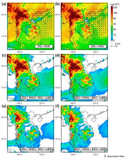 The performance of CMAQ simulations for PM10 concentrations at ground-level was evaluated at Bangkok and Chiang Mai in Thailand. The FNL + FINN case performed best for both the full year and the two-month period when BB activities were intensified in 2014. To compare the impacts of input data (BB emission inventories and atmospheric reanalyses) on simulated PM10, we introduced the normalized percentage difference for FNL + FINN and the other three cases (FNL + GFED; ERA + FINN; ERA + GFED) for annual mean and maximum daily mean PM10 concentrations in 2014 at the two observation sites. At both of the two sites, the normalized percentage difference for annual mean and maximum daily mean PM10 concentrations in 2014 for FNL + FINN and the two cases applying GFED v4.1s for BB emissions (FNL + GFED; ERA + GFED) was larger than that between FNL + FINN and ERA + FINN cases. In particular, the difference for maximum daily mean PM10 concentrations at Chiang Mai for FNL + FINN and the two cases applying GFED v4.1s (−53% to −27%) was much larger than that between the FNL + FINN and ERA + FINN cases (10%).