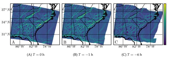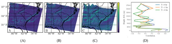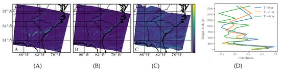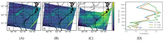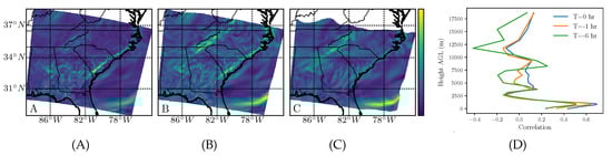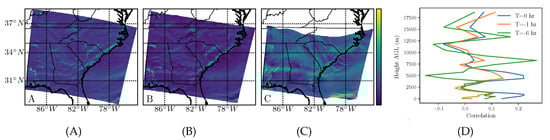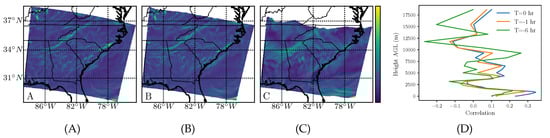The correlation with the wind-only FTLE is shown in (D), revealing high correlation in the troposphere for all three time scales and then a slight peak around 8.25 km at the longest time scale (6 h). Further analysis suggested that the peak may be associated with a southerly jet stream aloft transporting water vapor. Furthermore, notice the nearly linear inland attracting filament parallel to the South Carolina and North Carolina coasts, which was in both the water vapor attraction fields for 0 and h (Figure 4A,B) and also the corresponding low altitude wind-only attraction fields (Figure 2A,B). The filament seemed to follow the front due to the onshore winds blowing from the Atlantic Ocean.