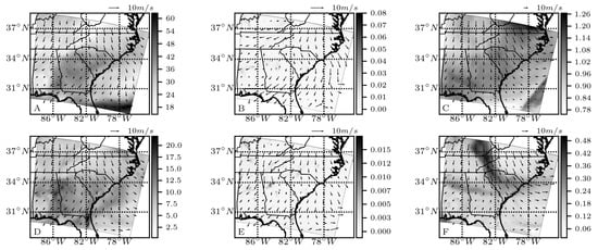 Figure 3 shows the column-integrated species amount for the six chemical species considered in this study superimposed with their vector fluxes , at the initial time, . High concentrations of water vapor were seen over the ocean, as well as along the Atlantic coastal plain. As expected, the areas of high concentrations for pollutants such as SO, SO, and NO were associated with urban regions in the southeast United States [42,43]. High ozone and sodium regions, on the other hand, were due to plumes transporting these species aloft.