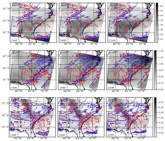 To illustrate the predictive ability of the ridges of the and fields to capture the dominant behavior in the vertically-integrated species amounts, we overlaid them, in blue and red, respectively, over the species amount at the initial time, 15:00, for water vapor, in the top left of Figure 10.