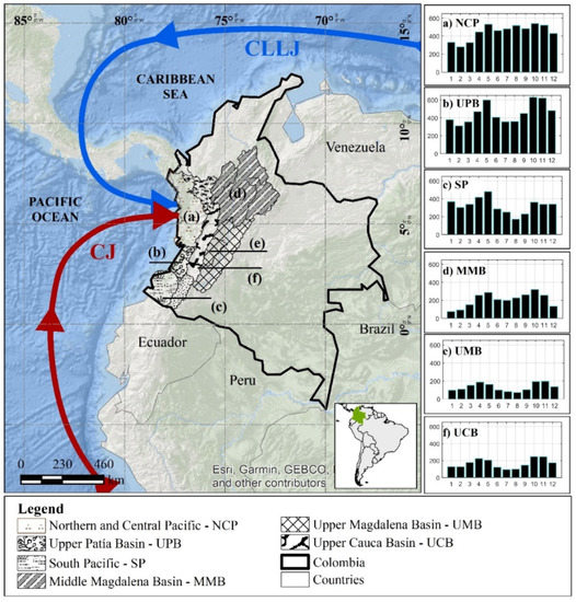 Northwestern South America (SA) has a complex atmospheric dynamics modulated by several factors such as the Intertropical Convergence Zones (ITCZ) of the Atlantic and Pacific Oceans, moisture transport from the Amazon Basin, the trade winds, and the local topography characterized by three branches of the Andes in Colombia. The dynamical factors, interacting with the local processes, determine the spatiotemporal variability of precipitation in the area [1]. The ITCZ, through its meridional migration, modulates the annual rainfall cycle, which is bimodal or unimodal over Northwestern South America [2,3,4,5,6]. The rainfall regimes in six Colombian regions are illustrated in Figure 1: the northern and central Pacific region of Colombia (NCP), the Upper Patía Basin (UPB), the Pacific region of Southern Colombia (SP), the Middle Magdalena Basin (MMB), the Upper Magdalena Basin (UMB), and the Upper Cauca Basin (UCB). The NCP region has uniformly distributed rainfall year-round without a defined dry season, due to the persistence of the ITCZ, the convergence of the trade winds at the equator and the Choco Low-Level Jet (CJ), which interacts with the mesoscale convective systems [7,8] (Figure 1a). The SP region presents a bi-modal annual cycle with two wet seasons, one in April–May (AM) and the other in October–January, and dry seasons in June–September and February–March (Figure 1c). The Colombia Andean region, which includes the MMB, UMB, and UCB, experiences an annual bi-modal cycle with two wet seasons, one in AM and the other in September–November (SON), and dry seasons in December–February (DJF) and June–August (JJA), mainly due to the ITCZ crossing twice the equator [2,4] (Figure 1d–f). However, the annual rainfall cycle in northwestern SA is not entirely explained by the meridional migration of the ITCZ. The connection of the ITCZ and the dynamics of three Low-Level Jets (LLJs), are fundamental in transporting water vapor from oceanic to continental masses [9,10,11,12] and might influence local precipitation patterns. Namely the CJ [7,9,13], the Caribbean Low-Level Jet (CLLJ) [14,15,16,17], and Corriente de Los Llanos Orientales, or Eastern Andes Jet are important precipitation-generating mechanisms in the region.