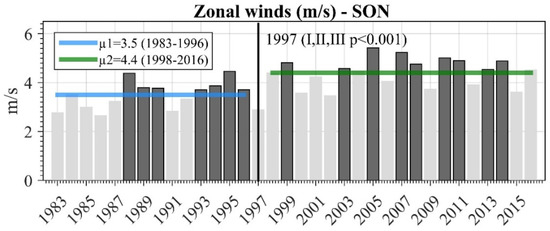 The SON zonal wind index shows an upward break in 1997 (p < 0.001) identified with the three statistical tests (Figure 2). The rupture year in 1997 justifies to split the SON zonal wind index into two times series, one spanning over the 1983–1996 period and the other over the 1998–2016 period, defined from now on as periods before and after 1997. In Figure 2 the straight lines parallel to the x-axis represent the averages of the 1983–1996 and 1998–2016 periods. The SON index reaches mean (maximum) values around 3.5 (4.5) m/s during 1983–1996 and 4.4 (5.4) m/s during 1998–2016. These values are consistent with those previously found to characterize the CJ [9,11,12,20]. Thus, the SON index shows higher values after 1997 than before.