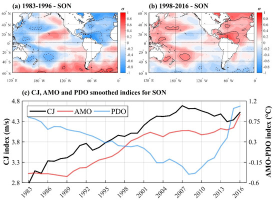 In addition, the periods before and after 1997 overlap those with distinct low-frequency SST backgrounds associated with the PDO and the AMO previously discussed by Kayano et al. [40,79]. In fact, SST anomaly mean state during the 1983–1996 period shows features of the CAMO/WPDO and that during 1998–2016, of the WAMO/CPDO background (Figure 3a,b). Additionally, the CJ and AMO indices are significantly and positively correlated with a correlation of 0.93, and the CJ and PDO indices are significantly and negatively correlated with a correlation of −0.69 (Figure 3c). These results indicate that the AMO and PDO backgrounds after 1997 contribute to strengthen the CJ, and those before 1997, to weaken the CJ. Therefore, our analyses for the two selected periods can be interpreted in terms of the multidecadal variability.