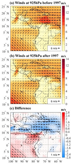 Figure 4 shows the 925 hPa wind vector pattern in northwestern SA for the years before and after 1997. The CJ is well established during both periods with winds of 5–6 m/s centered around 5° N (Figure 4a,b). These results are consistent with previous studies on the presence of the CJ during SON when the maximum annual peak of the winds occurs [7,9,12]. Meanwhile, the CLLJ speed varies from 8 m/s to 10 m/s over the Colombian Caribbean at 70°–80° W and 12°–15° N. A notable feature is the inverse relationship between the CJ and CLLJ intensities, with a strong (weak) CJ and a weak (strong) CLLJ after (before) 1997. Additionally, the CJ is clearly observed over the easternmost fringe of the tropical Pacific west of the coast of Peru and Colombia, with a strong southerly component (Figure 4a,b). According to Poveda and Mesa [7] and Poveda et al. [9], this characteristic is explained by (1) topographic lifting; (2) predominant north–south orientation of the SA northwestern coast; and (3) SST and SLP gradients between the Ecuador–Peru cold tongue and the Western Colombian coast. Figure 4c shows the difference composite of the 925 hPa winds between the two analyzed periods. In this case, the scalar field refers to the difference of the wind magnitudes. The positive anomalies in the CJ region indicate the CJ strengthening, and the negative anomalies around 15° N in the CLLJ region indicate its weakening after 1997 (Figure 4c).