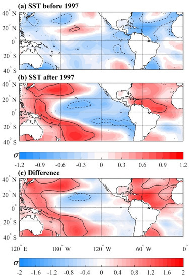 Standardized SST anomalies during SON events: (a) Before 1997, (b) after 1997, and (c) the difference (after minus before). Composites were based on the monthly standardized anomalies regarding the 1983–2016 period. Continuous (dashed) contours encompass positive (negative) values which are significant at the 95% confidence level.