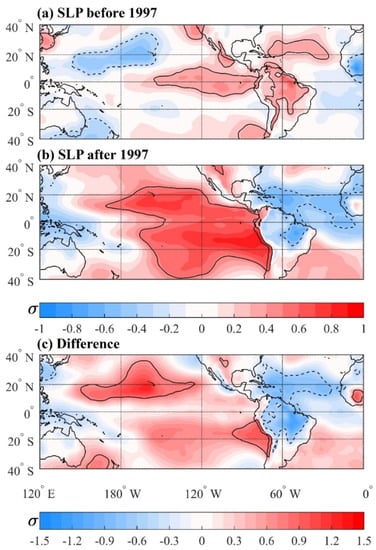 Standardized SLP anomalies during SON events: (a) Before 1997, (b) after 1997, and (c) the difference (after minus before). The display is the same as in Figure 5.