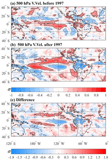 Standardized 500 hPa vertical velocity in the pressure coordinate anomalies during SON events: (a) Before 1997, (b) after 1997, and (c) the difference (after minus before). The display is the same as in Figure 5.