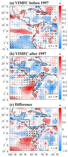 Standardized anomalies of VIMFC (vectors) and its convergence (shades) during SON events: (a) Before 1997, (b) after 1997, and (c) the difference (after minus before). In (a)–(c), vectors in bold indicate regions with significant changes and continuous (dashed) contours encompass positive (negative) values which are significant at the 95% confidence level. The arrow at the bottom of each panel illustrates the base magnitude of the VIMFC vector in σ.