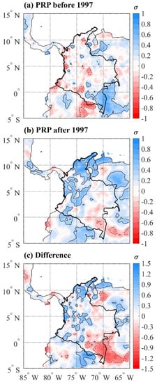 After 1997, consistent with the circulation anomaly patterns, positive precipitation anomalies occur over northwestern SA (NCP, the Colombian Andes, represented by the MMB, UMB, and UCB regions) and normal conditions prevail over southwestern Colombia (SP and UPB regions) (Figure 9b,c). This precipitation pattern is caused by a strong CJ and a weak CLLJ, which contribute to intensify the moisture transport from the Eastern Pacific into western Colombia between 3° S and 9° N (Figure 4c and Figure 8c). On the other hand, before 1997, normal precipitation prevails in most of the Colombian territory, except in southeastern Colombia, where positive precipitation anomalies are noted (Figure 9a). The differences between the two periods reflect the positive anomalies in northwestern Colombia in the period after 1997 and the positive anomalies in Southeastern Colombia in the period before 1997 (Figure 9c).
