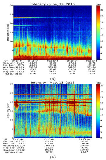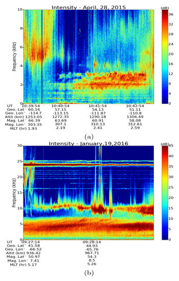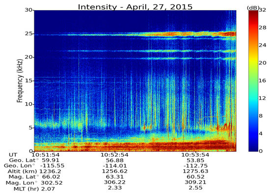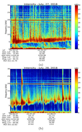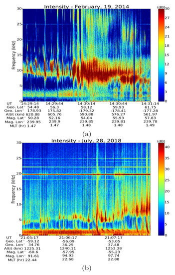 Figure 2a, the observation was made by ePOP-RRI on 19 February 2014 and in addition to the hiss band (1 kHz–4 kHz) clearly shows the intensification of LH noise by the echoing whistlers at higher frequencies (5 kHz–15 kHz). In