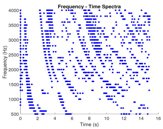 Frequency-time spectrogram of simulated waves passing through a 1200 km × 1200 km section extending from the equator, which is located km away from the surface of the Earth. Out of all the waves passing though this surface only 300 waves were used to plot this spectrogram to show that the initial frequency dispersion observed with whistlers disappears after about 10 s and the observation becomes random and hiss-like.