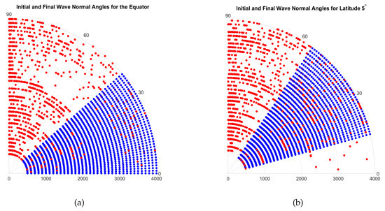 In both figures, initial wave normal angles are indicated in blue and the final values are in red. Figure (a) shows the initial and final wave normal angles for the waves launched at the equator and (b) shows the initial and final wave normal angles for the waves launched at latitude . In both cases, the near-parallel wave normal angles change to more oblique values as a wave propagates. In otherwords the whistler wave normal angles become more hiss-like wave normal angles.