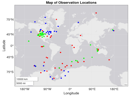 A map showing the geographic locations of ePOP events. Red markers indicate events where whistlers coexist with hiss, green markers show the locations where whistlers were observed but no hiss, and blue markers represent the events hiss was observed but no whistlers.